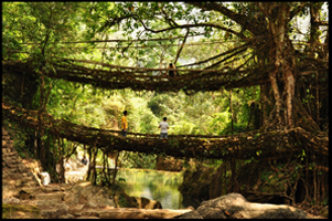 Meghalaya's double-decker and single-decker root bridges are unique in the world and are a sight to behold. The bridges are tangles of massive thick roots, which have been intermingled to form a bridge that can hold several people at a time. Khasi people have been trained to grow these bridges across the raised banks of streams to form a solid bridge, made from roots.
